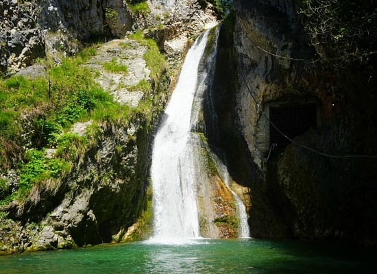 Под водопадом озеро с чистой изумрудной водой, в летнее время в нем охлаждаются гости ущелья.
