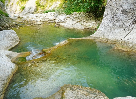 Неиспугавшихся спуска ждет вознаграждение. Река Мачара промыла здесь в практически белом русле узкие извилистые протоки, ванны, котлы, соединенные между собой перекатиками – природный спа с чистейшей прохладной водой.