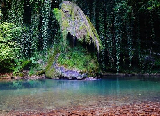 Даже такие искушенные абхазскими достопримечательностями туристы, как мы, на мгновение замерли от восхищения: водопад называют Медвежье ухо, но, скорее, это ухо, торчащее из-за завесы плюща, какого-то сказочного существа, тролля или гнома, навеки замурованного в горах. Ухо опущено, поросло мхом, по нему мелкими струйками бежит вода, постепенно наполняя широкий бассейн. Чем-то напоминает водопад Зонтик в Нагорном Карабахе, но гораздо эффектнее: в какой-нибудь другой стране была бы топовая достопримечательность, а в Абхазии пока пребывает в забвении. Бонусом можно искупаться в прозрачном маленьком «озерце», кристальном по краям и бирюзовым по мере углубления. Обрамление из кирпичного цвета плоских камней дополняет живописную картину.