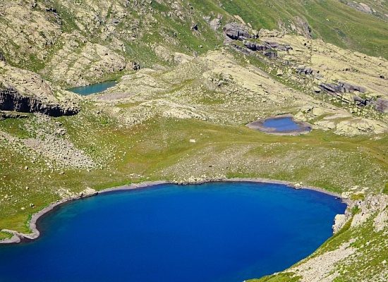 Если у вас есть время и силы, можно спуститься к Дерекуаре и продолжить путь по озерам Куниашты, дойти до Адуэды и безымянных озер. После 5 километров дороги с набором высоты 1000 метров (с 1700 до 2700 над уровнем моря) ни того, ни другого у нас не было. Задача выполнена: разведана пешеходная дорога от озера Башиш к озерам Голубого ожерелья Кодора. Стартанули мы в 7 утра, на перевале были в 13;00, спустились в лагерь на карьерном озере к 17:30.