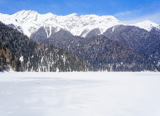 Посетителей практически не было. Мы спустились ближе к озеру и устроили фотосессию с добытой по дороге яркой желтой пушистой мимозой. А потом - нужно же дойти до Птичьего водопада. Уже второй раз за год! Дорога занесена снегом с узкой тропой, укатанной снегоходами; в некоторых местах приходилось взбираться на снежные горки, образовавшиеся из заносов и лавин. Фото тропы - последнее в карусели. Даже не верилось в то, что мы знаем достоверно: летом по это дороге спокойно в 2 полосы ездит поток машин. Скорее всего, такая снегоходная дорога проложена до Дачи Сталина и, в другую сторону, до Студенческой поляны. Мы же дошли только до Птичьего водопада, посмотреть на обледенелую красавицу Рицу.