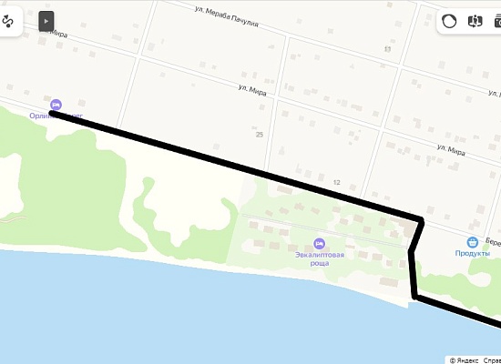 От гостевого дома "Орлиный берег" необходимо повернуть налево, пройти 800 метров по дороге и после окончания забора пансионата "Эвкалиптовая роща" повернуть направо. Далее - пройти мимо пансионата и спуститься на пляж. После спуска пройти налево около 200 метров.