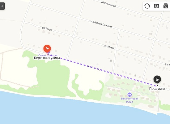 От гостевого дома "Орлиный берег" необходимо повернуть налево, пройти 750 метров по дороге. Магазин расположен на Береговой улице слева, напротив пансионата "Эвкалиптовая роща".