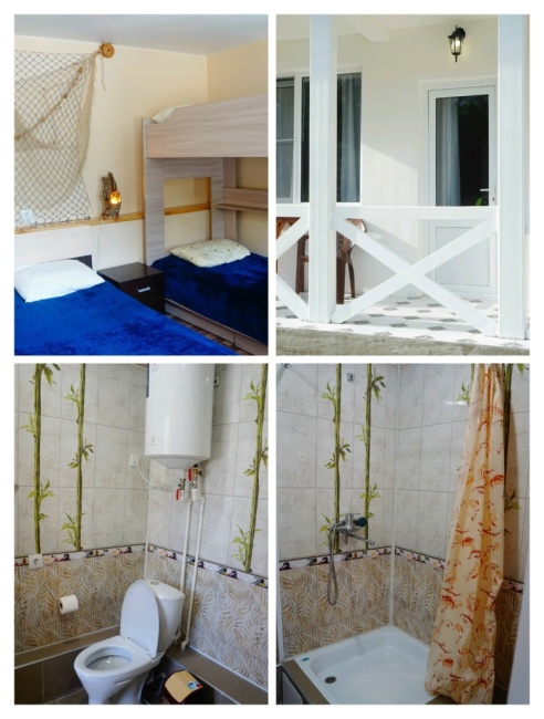 Четырехместный номер с двуспальной кроватью, детской двухъярусной кроватью и балконом. Площадь номера - 22 кв. м. Площадь балкона - 9 кв. м. В номере - комод, вешалка, 2 тумбочки, санузел (душ, туалет, раковина), кондиционер. На балконе - столик с двумя стульями. 1 этаж. Возможно как трехместное, так и четырехместное размещение. Наши цены.