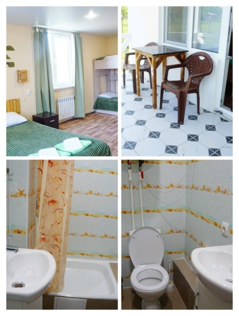 Четырехместный номер с двуспальной кроватью, детской двухъярусной кроватью и балконом. Площадь номера - 24 кв. м. Площадь балкона - 8 кв. м. В номере - комод, вешалка, 2 тумбочки, санузел (душ, туалет, раковина), кондиционер. На балконе - столик с двумя стульями. 1 этаж.